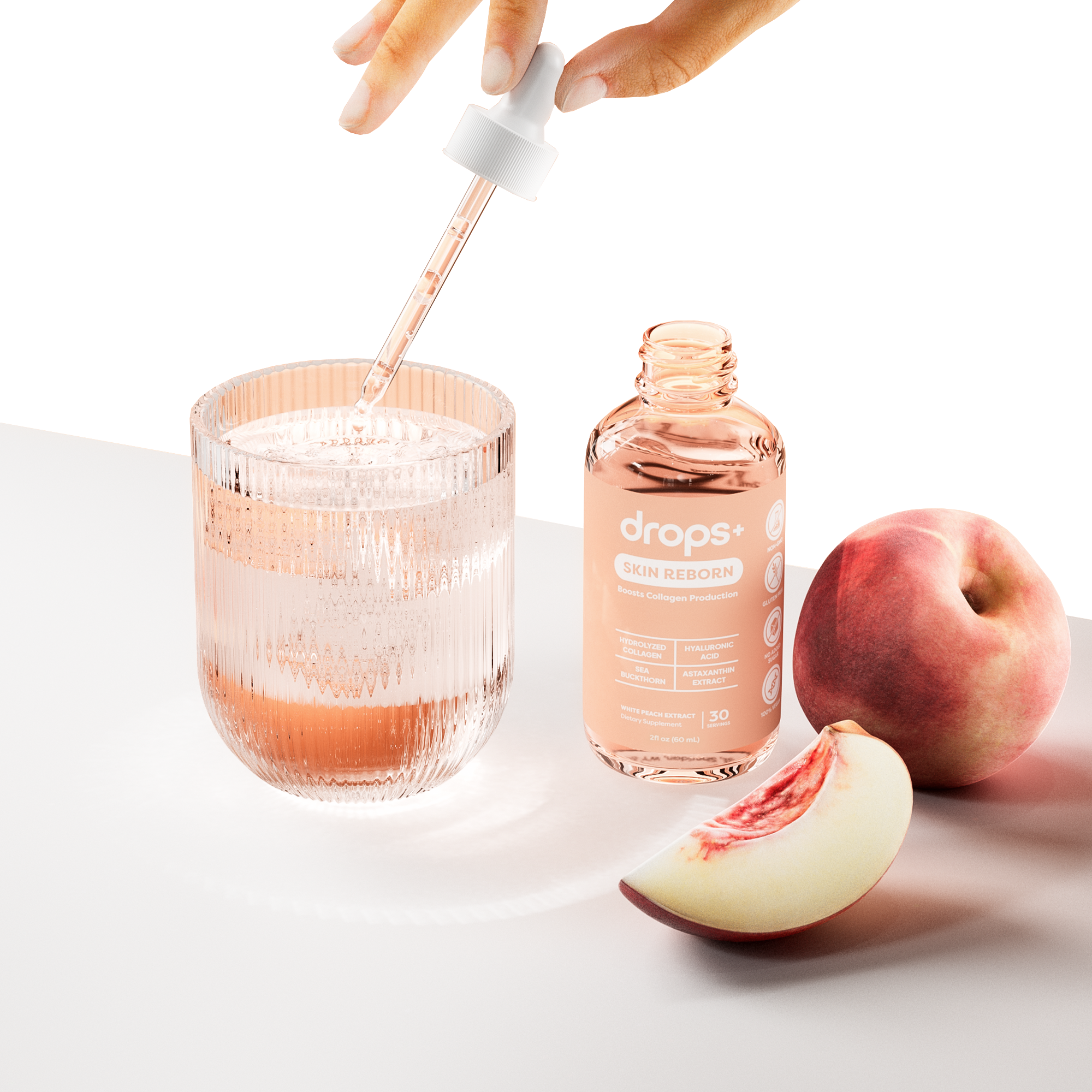 Our Skin Reborn drops support your skin's natural collagen production from within. They help improve firmness, hydration, and overall skin health as you age. The delicate white peach flavor makes it a daily ritual you'll enjoy. Over time, your skin feels smoother and looks more radiant.